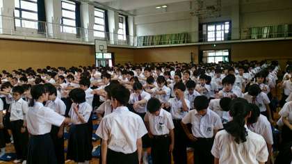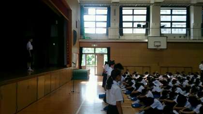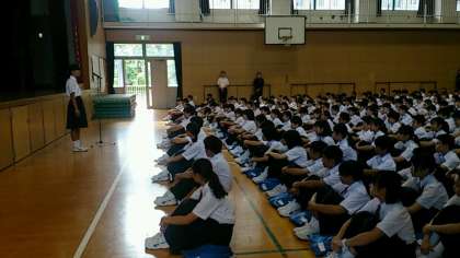 全校集会が生徒会の進行で行われています。生徒会長の全体指揮、それを受け学級代表が クラス整列を行っています。