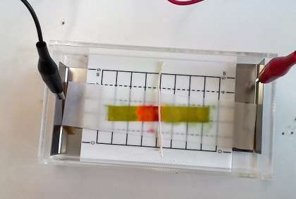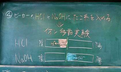 pH試験紙の色の変化を通じて、電圧をかけることで塩酸や水酸化ナトリウムに含まれる水素イオンや水酸化物イオンが移動することを確認していました。