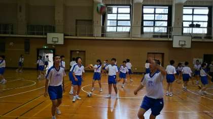 オーバーハンドパス、アンダーハンドパスを使ったパス練習をしています。