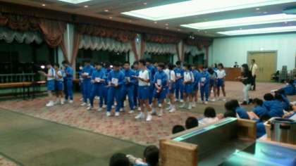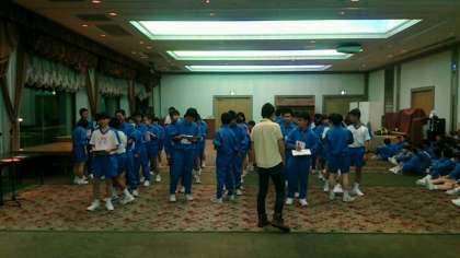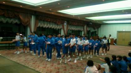 与えられた漢字一文字を先頭から後ろへ背中に書いて伝えるゲームです。なかなか難しいようです。