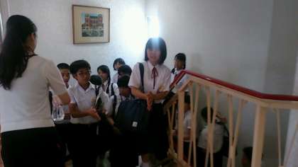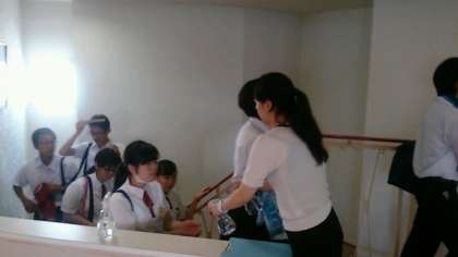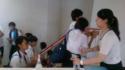 フィールドワークを終え、昼食会場に帰ってきました!かなり暑い中でしたので、少しバテ気味の人もいますが、無事に終了しました。手の消毒をし、昼食です。
