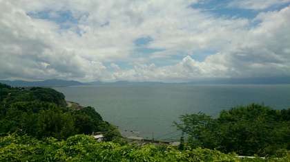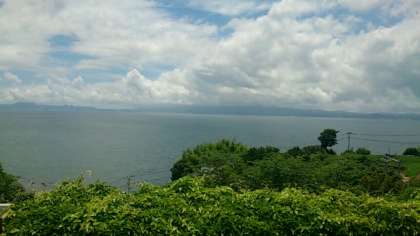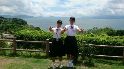 大村湾の素晴らしい眺めです!バスに戻る東中生に収まってもらいました。