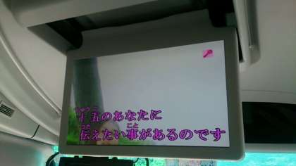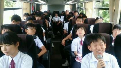 大村SAを出発しました。バスは博多駅を目指します!車内では、早速カラオケ大会、第4弾!です。何んと!合唱コンクールの3年生課題曲、「手紙」〜拝啓 15の君へ〜が飛び出しました!