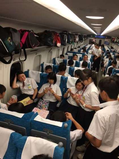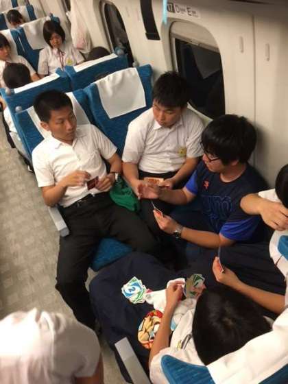 車内は賑やかです。先生もカードゲームに参戦しています!