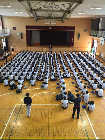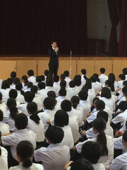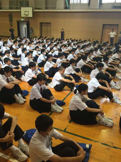 おはようございます。修学旅行中は当HPをたくさん見ていただき、ありがとうございました。本日は3年生が代休の中、2学年での集会です。7月に入り、およそ1年の3分の1が終了しました。