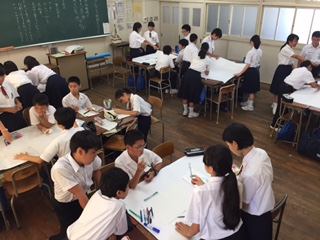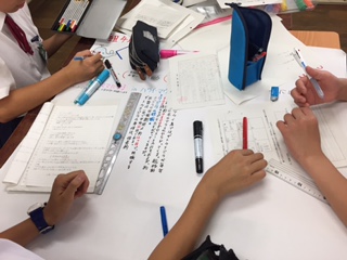 1年生では期末テスト前から「クジラの飲み水」という単元を学習してきました。その単元の集大成として、「クジラについて調べてきたことを新聞にする」という取り組みをグループ学習で行っています。この時間のために、これまで「クジラ」について調べたことをまとめたり、どんな新聞にするか班会議をしたりしてきました。今日はいよいよ模造紙に書き込んでいきます。この時間と次の時間で新聞を完成させ、その後には、班で発表する機会をもちます。教科書・授業で学んだことを、自分のものとして深める学習です。