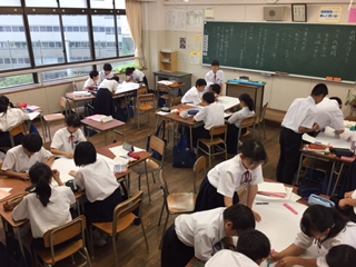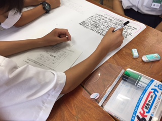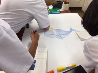 本日5限目、1年4組の国語の時間では、グループ学習として、「クジラ」についての新聞を作っています。1年生の教科書にある「クジラの飲み水」を学習した後の取り組みです。
