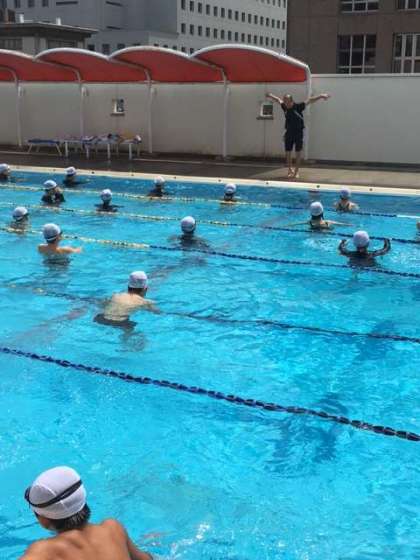 バタフライの技能の学習です。水泳部のお手本を見た後に、西邨先生がキックや水のかき方の観点を説明されながら練習しています。