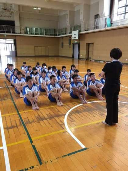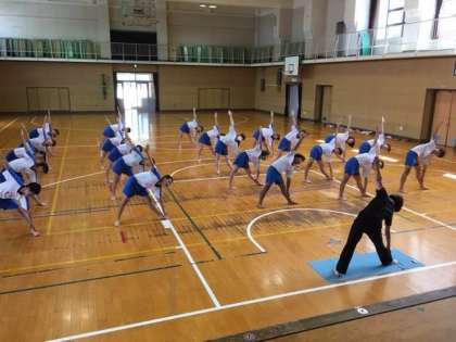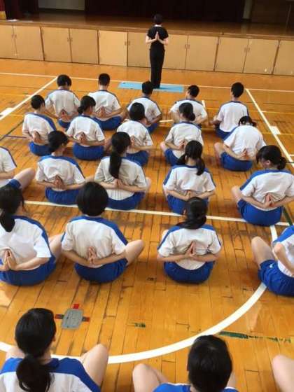 6時間目のグループのヨガ体験がはじまりました。早くも背中で合掌に苦戦しています。