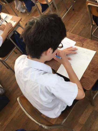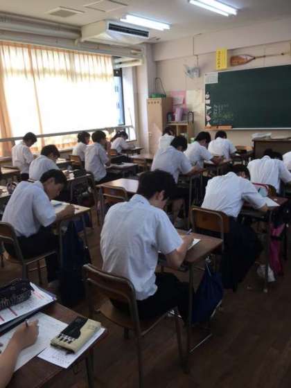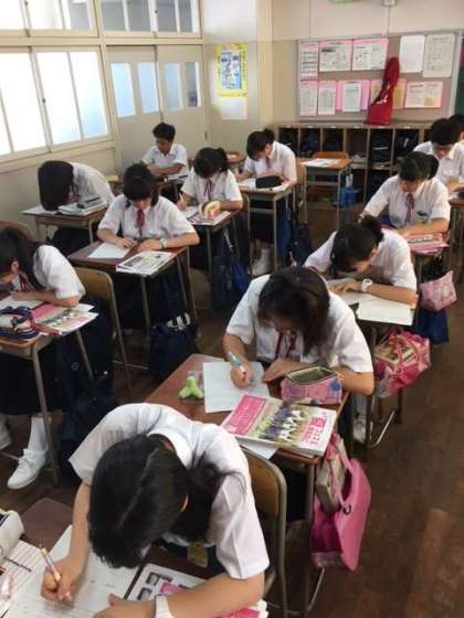 3年生は1時限目を前半・後半に分けて、先週実施されたプレハイスクールセミナーのまとめとともに、写真屋さんが撮影された修学旅行の写真を見る時間として取り組んでいます。