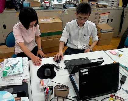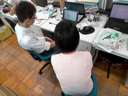 4限目の職員室、小池先生と萩原先生が熱心に授業用パソコンの画面をのぞいています。