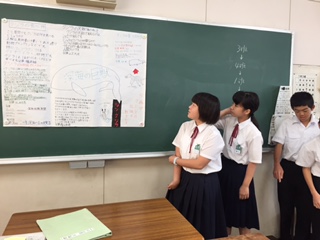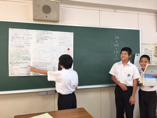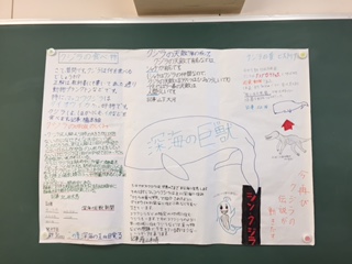 本日2限目、1年3組の国語の時間は、これまでに作成してきた「クジラ」についての新聞を用いて、1班〜6班までの各班全員が発表しました。