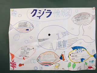 本日4限目、1年1組の国語の時間は、これまでに作成してきた「クジラ」についての新聞を用いての発表を実施しました。