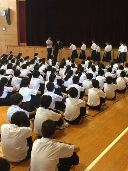 ソフトテニス部と漢字検定2級合格者が表彰を受けています。