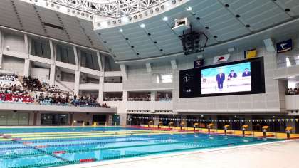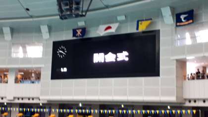 本日より3日間、大阪プールで開催されます。開会式の様子です。この後、競技が始まります。東中水泳部も各種目にエントリーしています。