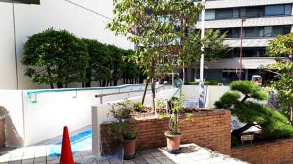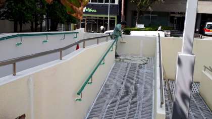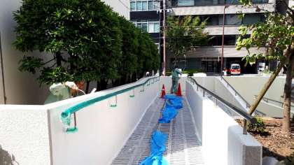 毎年、夏季休業中に管理作業員さんが、校舎内外施設の補修、塗装作業を行っていただいています。今回は、ピロティ周辺の塗装作業に続けて、スロープ周辺のリフレッシュをしていただいています。