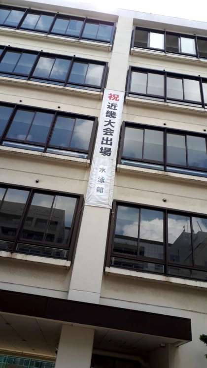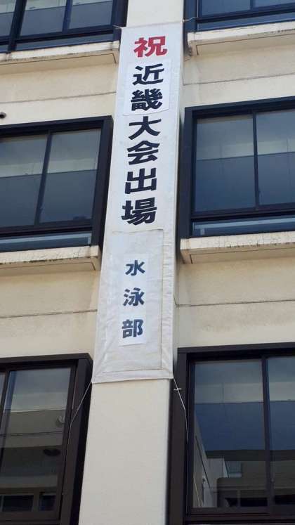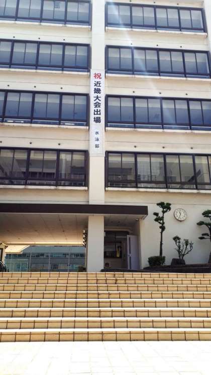 東中水泳部から、近畿大会に出場した輝かしい成果が、校舎の垂れ幕により、披露されています。東中前を往来される方々からも、注目されています!
