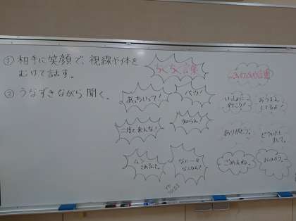 言われて嬉しい気持ちになる「ふわふわ言葉」、悲しい気持ちになる「ちくちく言葉」を確認して、実際にペアになりソーシャルスキルトレーニングをしました。