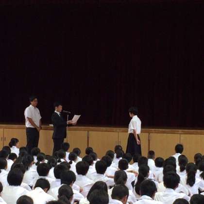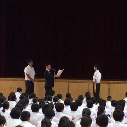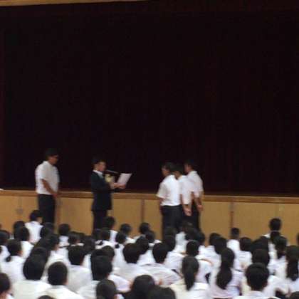 先週末、今週末と運動部活動の秋季総合体育大会を始め、中央区青少年指導員連盟主催のキックベース、ソフトボールた大会、また個人でも大会やコンクールに参加し、素晴らしい成果を上げてきた個人、チームがある。今、賞状の伝達を行いましたが、賞には至らなかったが、3年生の皆さんは、最後の大会に向けて、夏休みに厳しい練習に耐え、部の仲間や後輩たちと全力で努力してきました。結果が伴わなかったのは残念ですが、それ以上にたくさん得たものがあると思う。辛かったこと、悲しかったこと、悔しかったこと、一方、うれしかったこと、楽しかったこと、感動したこと・・・、本当にたくさんの思い出がこの2年半の中にいっぱい詰まっていると思う。そのすべてが皆さんの財産です。宝物です。仲間と意見が合わなかったり、理解し合えなかったりしたこともあるでしょう。しかし、そうして辛かったことや悲しかったことを、一つ一つ乗り越えてきて、真の仲間の大切さ、真の友情を実感することができたのではないでしょうか!3年生は、それぞれの部活動を引退していくことになりますが、部活動を通じて学んだこと、得たものを糧にこれからの中学校生活、そしてその先の自分の人生に活かしていってほしい。「何事にもあきらめずに、最後まで全力を尽くす」ことを貫いてほしい。自分で限界や妥協を決めず、無限の可能性を信じて、自分自身をもっともっと磨いてほしい。そして、この東中生の良き伝統を後輩たちに引き継ぎ、後輩たちは先輩方から受け継いでほしい。「誇りを胸に受け継げ東」!