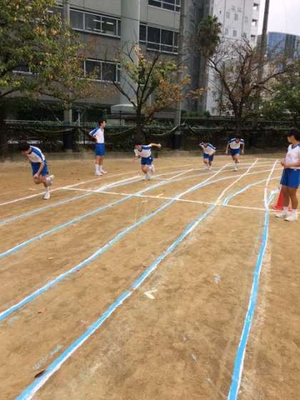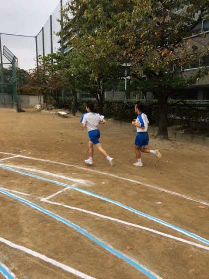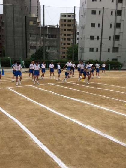 雨も降ることなく涼しいグラウンドです。1時間目から3年生3.4組が体育の授業で体育大会の各種目の練習を行っています。東中学校での最後の体育大会という自覚があるのか練習も真剣です。