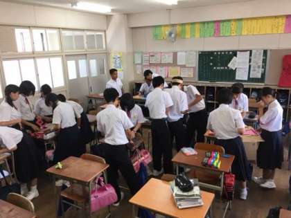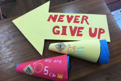 6時間目の学活では体育大会の応援グッズを制作しています。全員で役割分担して取り組むことができています。体育大会の応援が盛り上がりそうなグッズが完成しています。
