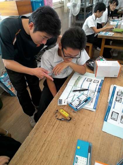 これに対して、橋本先生からはLEDにおける制限抵抗の役割などの説明があり、生徒たちは工夫しながらボード上で回路を組んでいました。