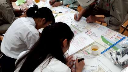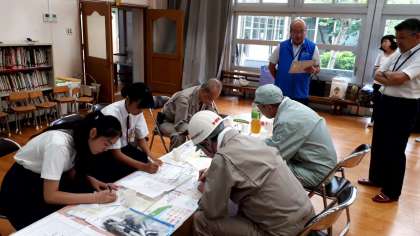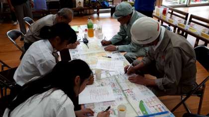 地域防災訓練が始まりました。本部に地震発生の一報が入ってきました。情報を書き取っています。