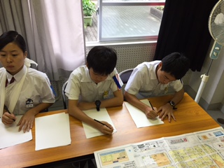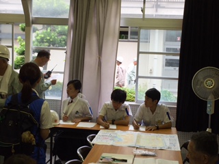 地域防災訓練の情報班の様子です。無線のやり取りをし、メモを取っています。