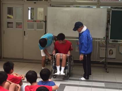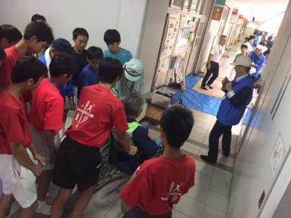 避難誘導班は怪我をして動くことができない人を発見したことを想定して、車椅子に乗せて救護班の所へ運ぶ訓練をしています。