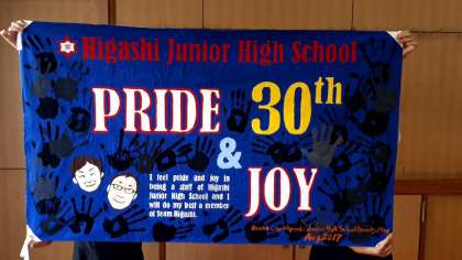 全校集会の最後に、創立30周年を記念し、体育大会に向けて教職員旗を作成しました。