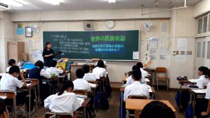 3限目、1年5組では、家庭科分野で「和服と洋服」の構成について、各国の衣装をICT活用して紹介しながら、楽しく充実した授業が進められています。
