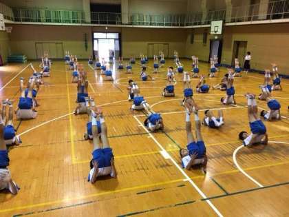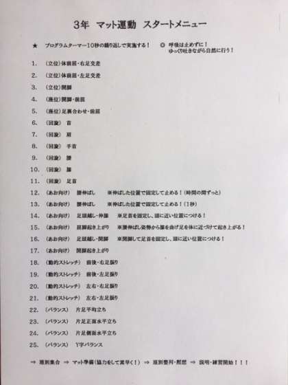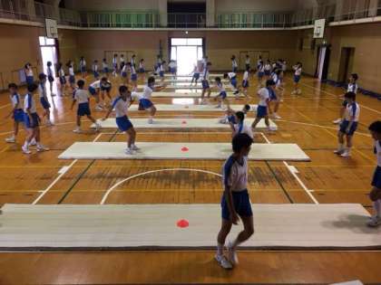 体育大会も終わり3年生の体育はマット運動が始まりました。ケガ予防や柔軟性を高めるためにスタートメニューを実施したのちマット運動に入ります。前転と後転の確認をしています。