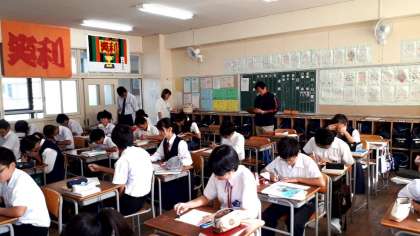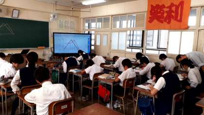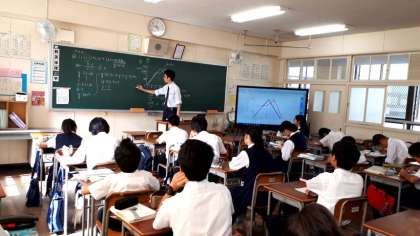 1時限目、2年3組では、数学科の単元「1次関数」で、習熟度別少人数の形態で、ICTを活用授業した授業に取り組んでいます。生徒の皆さんは、長文の問題に対して集中力を維持し、与えられた情報を適切に利用しながら、問題解決に頑張っています。