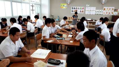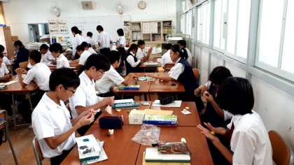 2時限目、2年1組では、美術科「オリジナル和菓子」制作の授業です。形や色合いを考え、工夫しながら取り組んでいます。