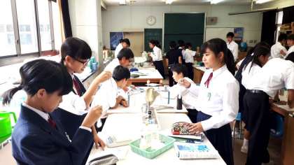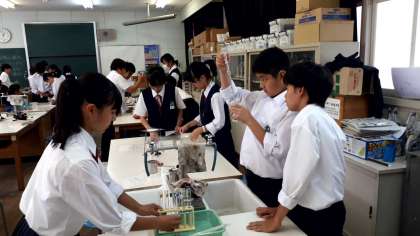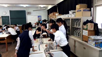 4時限目、1年4組の理科の授業では、理科室で「水にとけた物質のとり出し」の実験をしています。