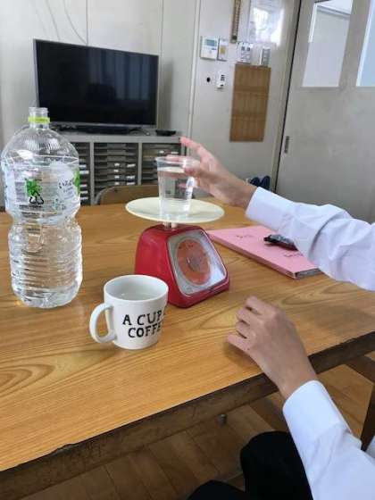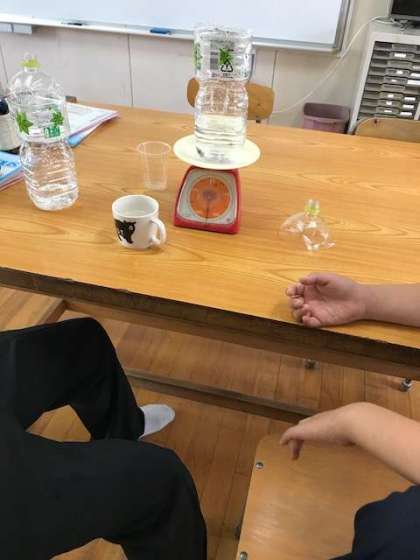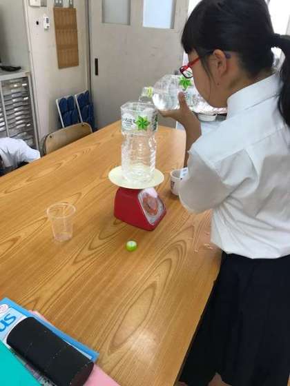 計量器を使った「重さ」の授業の様子です。計ることを楽しみながら学習しました。