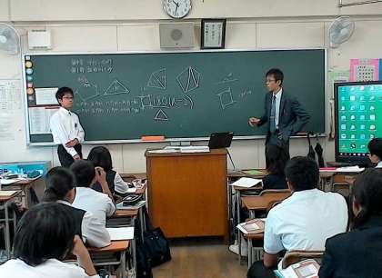 途中、発表者の考えを理解した別の生徒がピンチヒッターに出てくると、「長方形じゃなくて、ただの四角形で説明して!」など厳しい質問も飛び出し、授業が大いに盛りあがっています。