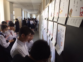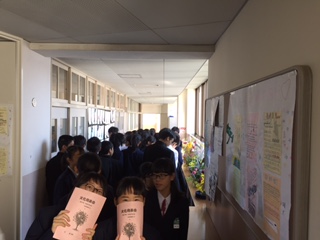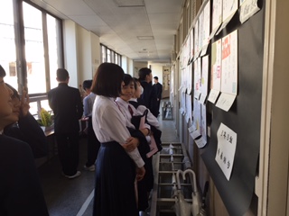 1年生の展示見学の様子です。3年生の書写作品を見学しています。