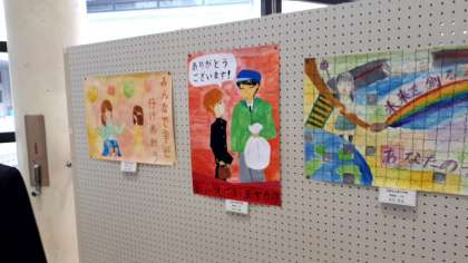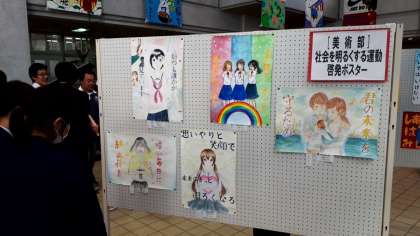 社明運動の入選作品や体育科の授業で取り組んだ100メートル走の結果も展示しています!