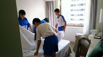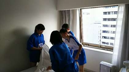 ホテル内での作業です。日頃目にしませんが、ホテルでは大切な仕事です。みんなで協力して作業をしています。
