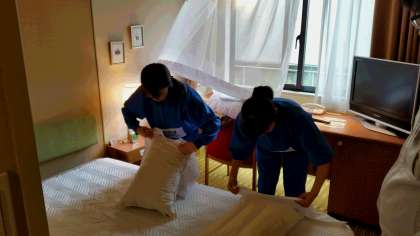 お客様がチェックアウトされた後のベッドメイキングです。シワひとつないようにするのに、苦労しています。