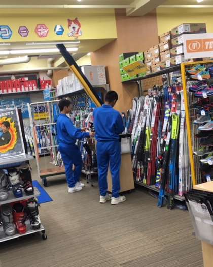 平日のお客さんは少ないので、スキー靴の値札付けをしていました。