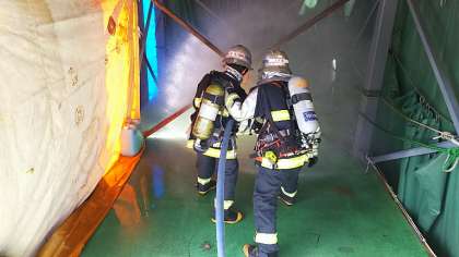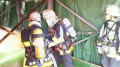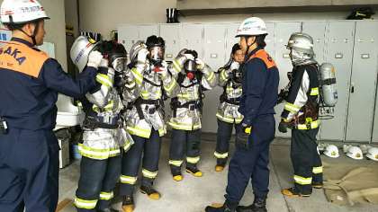 今日は防火服をつけての本格的な訓練です。ボンベの使い方も学んでいます。