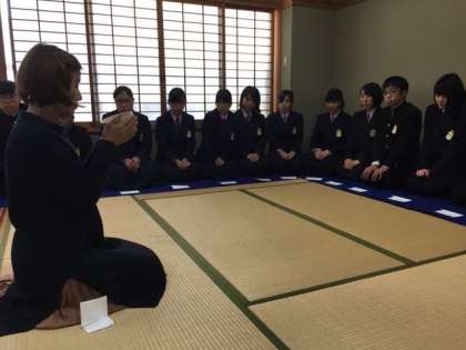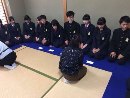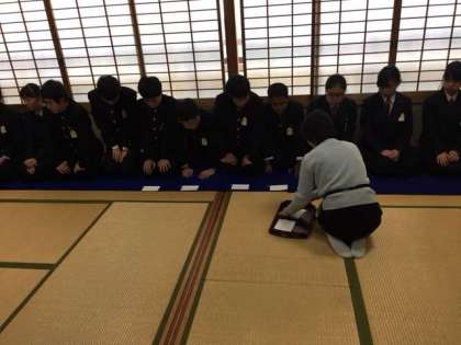 5時間目、5組の体験が始まりました。最初に茶室床の間にある「和敬清寂」という掛け軸についてご説明がありました。初めての体験に少し緊張しているようです。