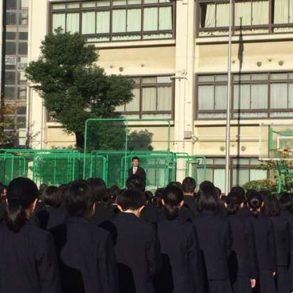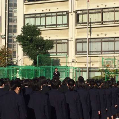 本日、運動場で全校集会を行いました。