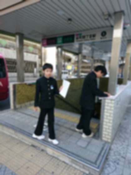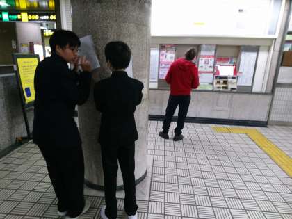 わかくさ学級だけの行事としては今年度はじめての電車・バス移動です。校舎3階のわかくさ学級から谷町四丁目駅券売機まで、歩いて何分かかるか?谷町四丁目駅には券売機がいくつあるか?切符を購入してから、他の人を待つスペースがあるか?など、先生と一緒に確認しました。