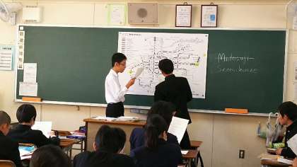 地下鉄の路線図を使っての道案内です。上手く案内できるか、まずは先生のデモンストレーションを見て学習します。