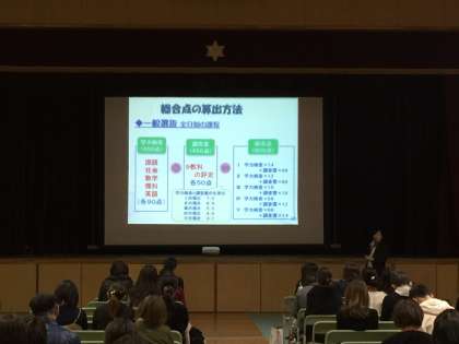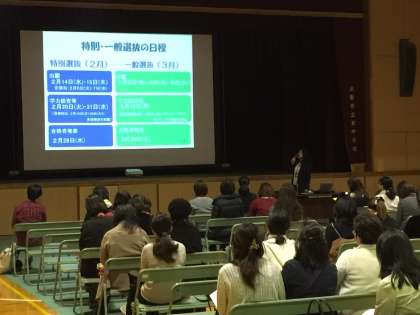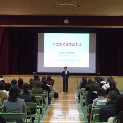 現在の高校入試のシステムに移行して3年目になりますが、3年生も高校入試が近づいてきました。今回も昨年度と同様に、大阪府教育庁教育振興室高等学校課の方々をお招きし、公立高等学校の状況や入学者選抜等について、ご説明をいただきました。保護者の皆さんの関心も高く、多くの方々にご参加いただいています。