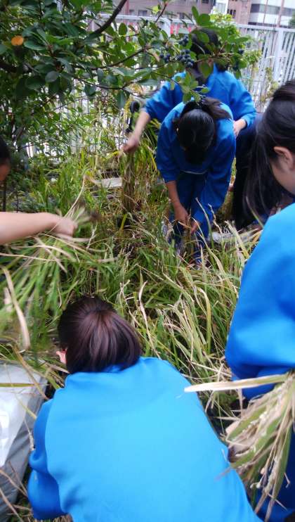 今日は、その白くなった稲の後処理をしています。稲?を抜き、土を払い、袋に詰め込んでいきます。