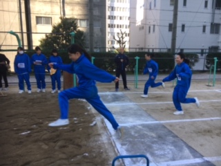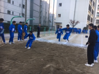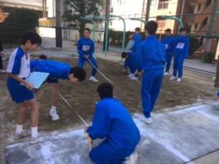 踏み切りを合わせて高く遠く! 班で協力して、計測しています。